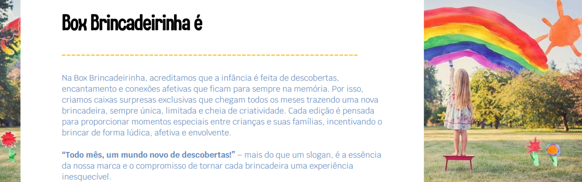 Todo mês, um mundo novo de descobertas chega à sua casa. O Box Brincadeirinha é uma assinatura mensal criada para transformar o tempo em família em experiências inesquecíveis.